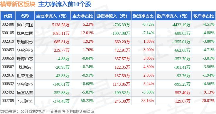 从资金流向上来看,当日横琴新区板块主力资金净流出1.15亿元,游资资金净流出408.13万元,散户资金净流入1.19亿元。横琴新区板块个股资金流向见下表: