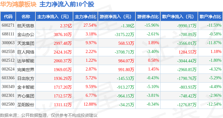 从资金流向上来看,当日华为鸿蒙板块主力资金净流出12.02亿元,游资资金净流入2751.32万元,散户资金净流入11.75亿元。华为鸿蒙板块个股资金流向见下表: