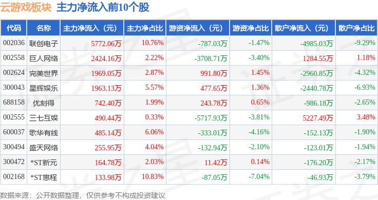 从资金流向上来看,当日云游戏板块主力资金净流出17.07亿元,游资资金净流入1.77亿元,散户资金净流入15.3亿元。云游戏板块个股资金流向见下表: