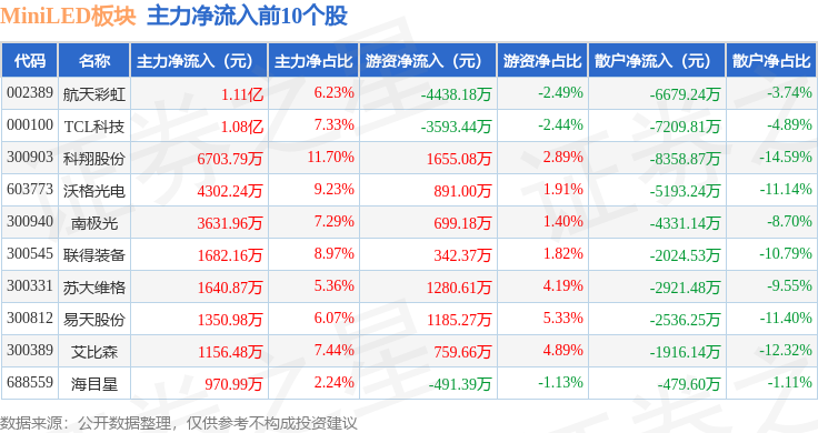 从资金流向上来看,当日MiniLED板块主力资金净流出20.46亿元,游资资金净流入2.47亿元,散户资金净流入17.99亿元。MiniLED板块个股资金流向见下表: