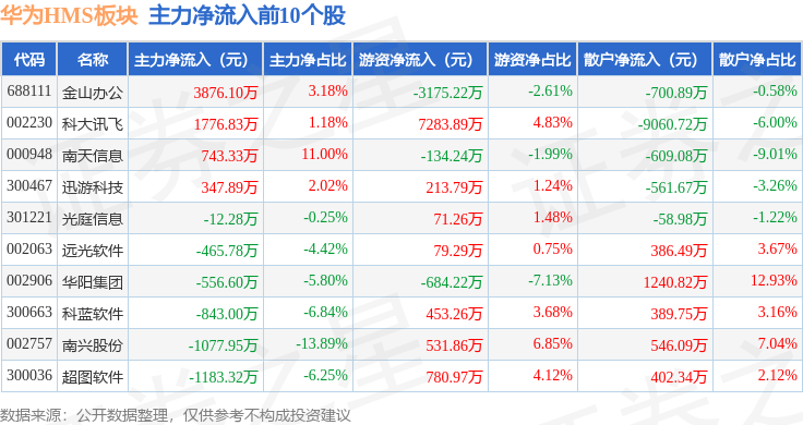 从资金流向上来看,当日华为HMS板块主力资金净流出4.44亿元,游资资金净流入2278.92万元,散户资金净流入4.21亿元。华为HMS板块个股资金流向见下表: