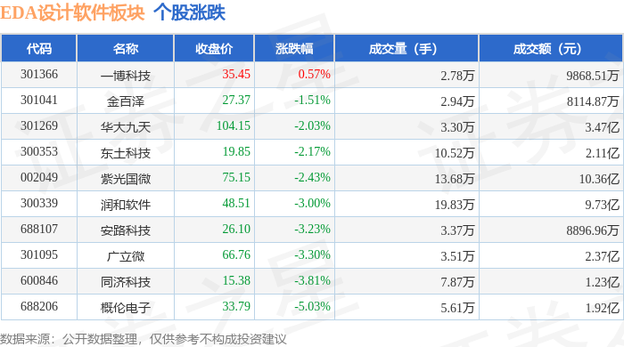 证券之星消息,12月15日EDA设计软件板块较上一交易日下跌2.69%,概伦电子领跌。当日上证指数报收于3867.92,下跌0.55%。深证成指报收于13112.09,下跌1.1%。EDA设计软件板块个股涨跌见下表: