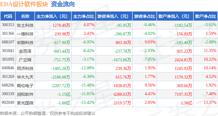从资金流向上来看,当日EDA设计软件板块主力资金净流出3.39亿元,游资资金净流入7501.01万元,散户资金净流入2.64亿元。EDA设计软件板块个股资金流向见下表: