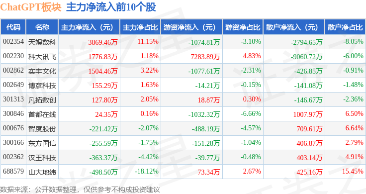从资金流向上来看,当日ChatGPT板块主力资金净流出21.58亿元,游资资金净流入1.22亿元,散户资金净流入20.36亿元。ChatGPT板块个股资金流向见下表:
