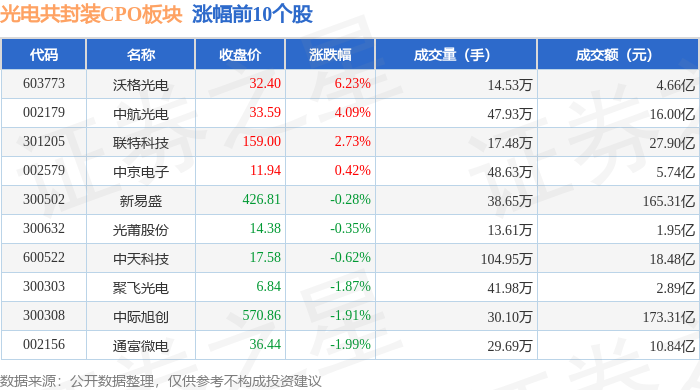 从资金流向上来看,当日光电共封装CPO板块主力资金净流出53.01亿元,游资资金净流入16.95亿元,散户资金净流入36.06亿元。光电共封装CPO板块个股资金流向见下表: