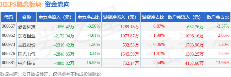 从资金流向上来看,当日HEPS概念板块主力资金净流出1.29亿元,游资资金净流入5193.31万元,散户资金净流入7690.24万元。HEPS概念板块个股资金流向见下表: