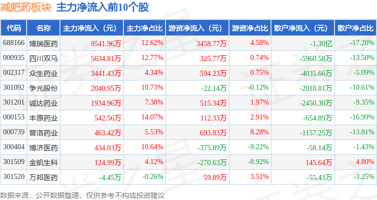 从资金流向上来看,当日减肥药板块主力资金净流出3.47亿元,游资资金净流入3.18亿元,散户资金净流入2873.93万元。减肥药板块个股资金流向见下表: