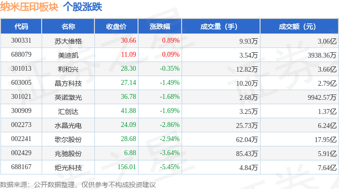 证券之星消息,12月15日纳米压印板块较上一交易日下跌2.78%,炬光科技领跌。当日上证指数报收于3867.92,下跌0.55%。深证成指报收于13112.09,下跌1.1%。纳米压印板块个股涨跌见下表: