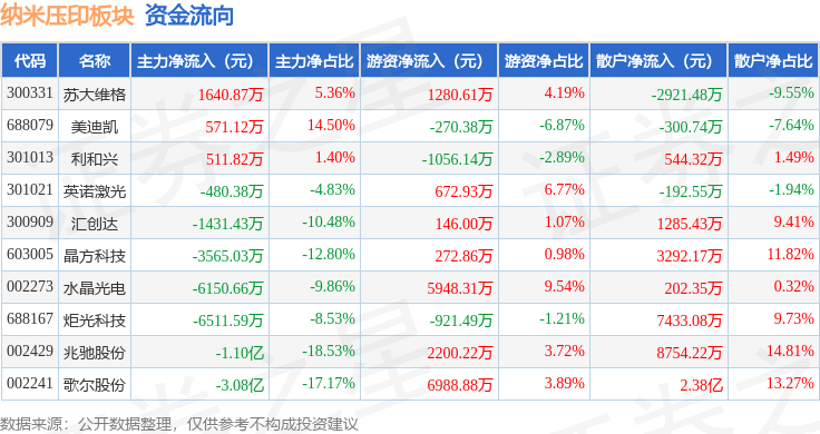 从资金流向上来看,当日纳米压印板块主力资金净流出5.72亿元,游资资金净流入1.53亿元,散户资金净流入4.19亿元。纳米压印板块个股资金流向见下表: