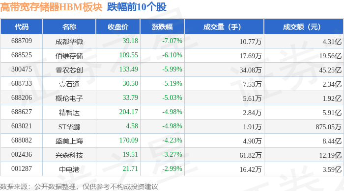 证券之星消息,12月15日高带宽存储器HBM板块较上一交易日下跌2.5%,成都华微领跌。当日上证指数报收于3867.92,下跌0.55%。深证成指报收于13112.09,下跌1.1%。高带宽存储器HBM板块个股涨跌见下表: