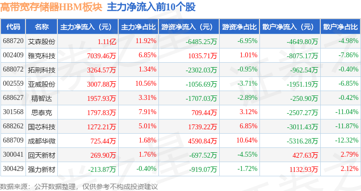 从资金流向上来看,当日高带宽存储器HBM板块主力资金净流出15.15亿元,游资资金净流入3.94亿元,散户资金净流入11.21亿元。高带宽存储器HBM板块个股资金流向见下表: