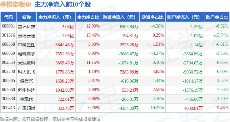 从资金流向上来看,当日多模态板块主力资金净流出15.7亿元,游资资金净流入3.4亿元,散户资金净流入12.3亿元。多模态板块个股资金流向见下表: