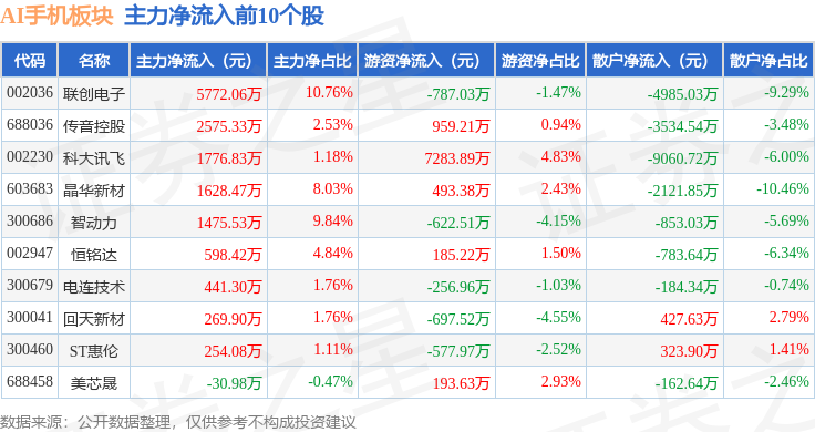 从资金流向上来看,当日AI手机板块主力资金净流出43.17亿元,游资资金净流入10.32亿元,散户资金净流入32.85亿元。AI手机板块个股资金流向见下表: