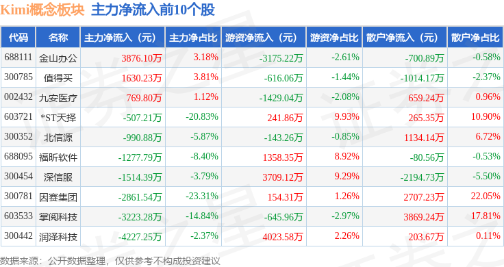 从资金流向上来看,当日Kimi概念板块主力资金净流出6.66亿元,游资资金净流入8269.85万元,散户资金净流入5.84亿元。Kimi概念板块个股资金流向见下表: