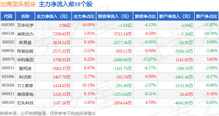 从资金流向上来看,当日出海龙头板块主力资金净流出69.41亿元,游资资金净流入19.21亿元,散户资金净流入50.21亿元。出海龙头板块个股资金流向见下表: