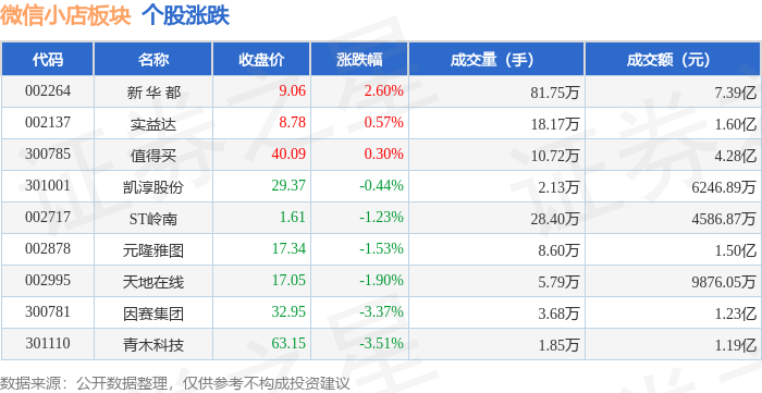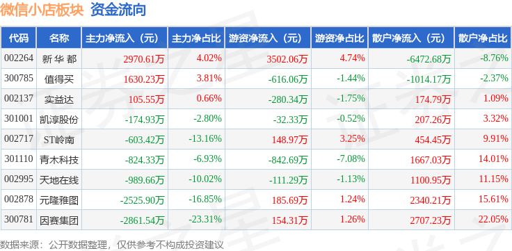 从资金流向上来看,当日微信小店板块主力资金净流出3273.39万元,游资资金净流入2108.31万元,散户资金净流入1165.08万元。微信小店板块个股资金流向见下表:
