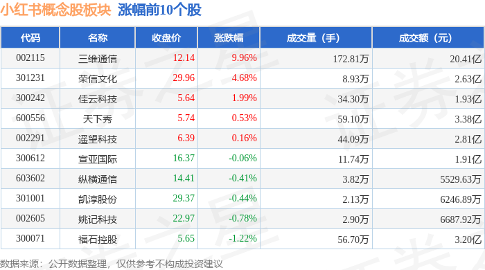 证券之星消息,12月15日小红书概念股板块较上一交易日下跌1.71%,引力传媒领跌。当日上证指数报收于3867.92,下跌0.55%。深证成指报收于13112.09,下跌1.1%。小红书概念股板块个股涨跌见下表: