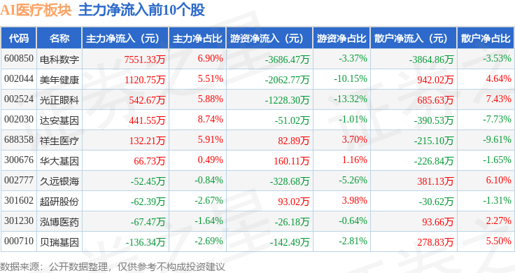 从资金流向上来看,当日AI医疗板块主力资金净流出1.38亿元,游资资金净流出2692.12万元,散户资金净流入1.65亿元。AI医疗板块个股资金流向见下表: