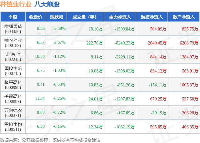 个股表现方面,种植业行业当日领跌股为宏辉果蔬(603336),该股当日报收8.58,下跌3.38%,成交量10.1万,主力资金净流出1399.84万元。神农种业(300189)以下跌2.67%紧随其后,该股当日成交量222.76万,主力资金净流出8249.23万元。除此之外,诺 普 信(002215)、国投丰乐(000713)、隆平高科(000998)均进入当日熊股之列。具体个股列表见下表: