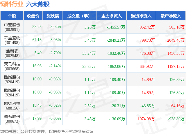 个股表现方面,饲料行业当日领跌股为中宠股份(002891),该股当日报收53.25,下跌3.04%,成交量3.26万,主力资金净流出1455.57万元。乖宝宠物(301498)以下跌3.03%紧随其后,该股当日成交量3.45万,主力资金净流出2849.21万元。除此之外,金新农(002548)、天马科技(603668)、路斯股份(920419)均进入当日熊股之列。具体个股列表见下表: