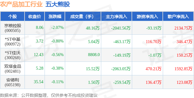 个股表现方面,农产品加工行业当日领跌股为京粮控股(000505),该股当日报收8.06,下跌2.07%,成交量48.16万,主力资金净流出2041.56万元。*ST中基(000972)以下跌0.8%紧随其后,该股当日成交量5.04万,主力资金净流出463.17万元。除此之外,*ST佳沃(300268)、双塔食品(002481)、安德利(605198)均进入当日熊股之列。具体个股列表见下表: