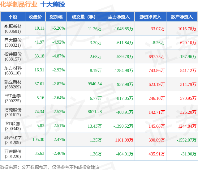 个股表现方面,化学制品行业当日领跌股为永冠新材(603681),该股当日报收19.11,下跌5.26%,成交量11.26万,主力资金净流出1048.85万元。同大股份(300321)以下跌4.92%紧随其后,该股当日成交量3.2万,主力资金净流出611.84万元。除此之外,松井股份(688157)、东方材料(603110)、凯立新材(688269)均进入当日熊股之列。具体个股列表见下表: