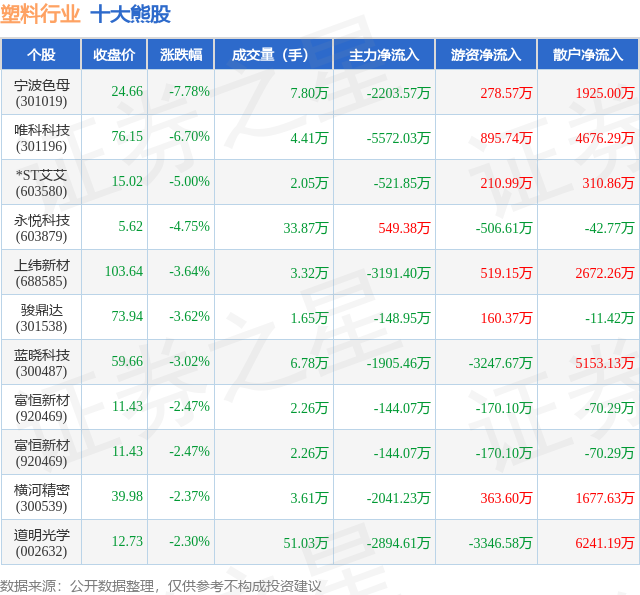 个股表现方面,塑料行业当日领跌股为宁波色母(301019),该股当日报收24.66,下跌7.78%,成交量7.8万,主力资金净流出2203.57万元。唯科科技(301196)以下跌6.7%紧随其后,该股当日成交量4.41万,主力资金净流出5572.03万元。除此之外,*ST艾艾(603580)、永悦科技(603879)、上纬新材(688585)均进入当日熊股之列。具体个股列表见下表: