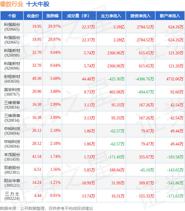 个股表现方面,橡胶行业当日领涨股为科强股份(920665),该股当日报收19.95,上涨29.97%,成交量22.37万,主力资金净流入2.28亿元。科强股份(920665)以上涨29.97%紧随其后,该股当日成交量22.37万,主力资金净流入2.28亿元。除此之外,科隆新材(920098)、科隆新材(920098)、彤程新材(603650)均进入当日牛股之列。具体个股列表见下表: