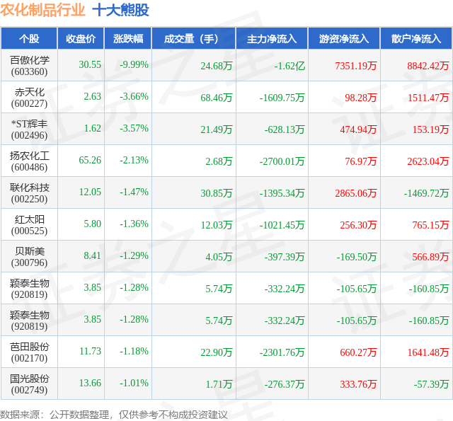 个股表现方面,农化制品行业当日领跌股为百傲化学(603360),该股当日报收30.55,下跌9.99%,成交量24.68万,主力资金净流出1.62亿元。赤天化(600227)以下跌3.66%紧随其后,该股当日成交量68.46万,主力资金净流出1609.75万元。除此之外,*ST辉丰(002496)、扬农化工(600486)、联化科技(002250)均进入当日熊股之列。具体个股列表见下表: