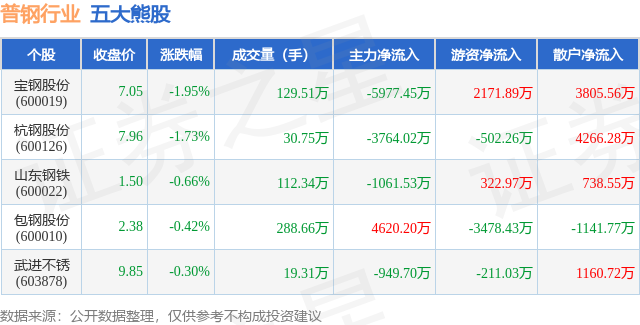 个股表现方面,普钢行业当日领跌股为宝钢股份(600019),该股当日报收7.05,下跌1.95%,成交量129.51万,主力资金净流出5977.45万元。杭钢股份(600126)以下跌1.73%紧随其后,该股当日成交量30.75万,主力资金净流出3764.02万元。除此之外,山东钢铁(600022)、包钢股份(600010)、武进不锈(603878)均进入当日熊股之列。具体个股列表见下表: