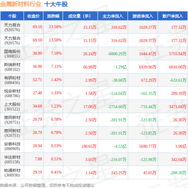 个股表现方面,金属新材料行业当日领涨股为天力复合(920576),该股当日报收69.1,上涨13.58%,成交量15.15万,主力资金净流入316.62万元。天力复合(920576)以上涨13.58%紧随其后,该股当日成交量15.15万,主力资金净流入316.62万元。除此之外,图南股份(300855)、斯瑞新材(688102)、有研粉材(688456)均进入当日牛股之列。具体个股列表见下表: