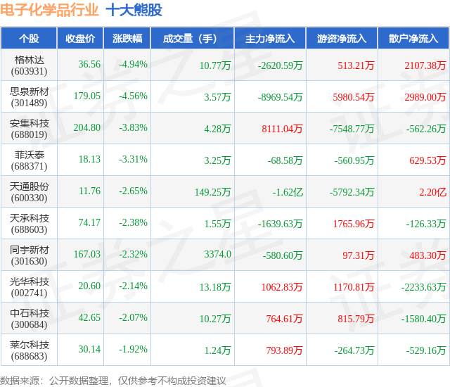 个股表现方面,电子化学品行业当日领跌股为格林达(603931),该股当日报收36.56,下跌4.94%,成交量10.77万,主力资金净流出2620.59万元。思泉新材(301489)以下跌4.56%紧随其后,该股当日成交量3.57万,主力资金净流出8969.54万元。除此之外,安集科技(688019)、菲沃泰(688371)、天通股份(600330)均进入当日熊股之列。具体个股列表见下表: