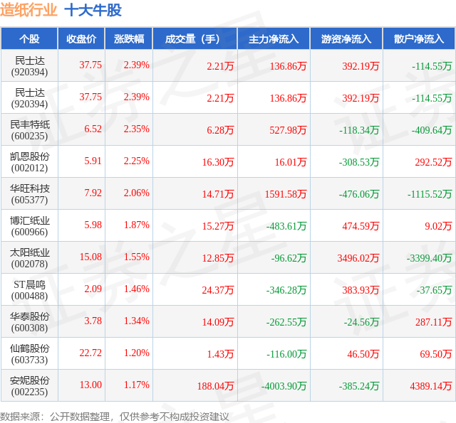 个股表现方面,造纸行业当日领涨股为民士达(920394),该股当日报收37.75,上涨2.39%,成交量2.21万,主力资金净流入136.86万元。民士达(920394)以上涨2.39%紧随其后,该股当日成交量2.21万,主力资金净流入136.86万元。除此之外,民丰特纸(600235)、凯恩股份(002012)、华旺科技(605377)均进入当日牛股之列。具体个股列表见下表: