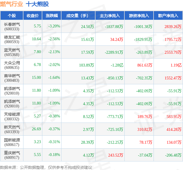 个股表现方面,燃气行业当日领跌股为长春燃气(600333),该股当日报收5.75,下跌3.2%,成交量24.5万,主力资金净流出1837.88万元。德龙汇能(000593)以下跌2.56%紧随其后,该股当日成交量15.61万,主力资金净流入34.24万元。除此之外,蓝天燃气(605368)、大众公用(600635)、首华燃气(300483)均进入当日熊股之列。具体个股列表见下表: