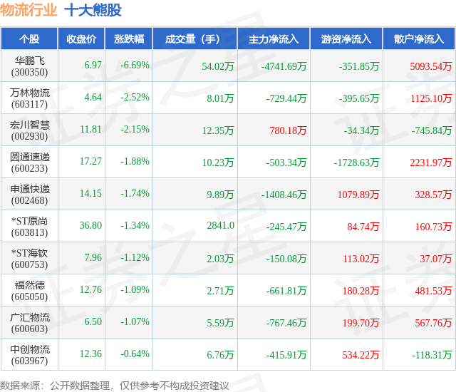 个股表现方面,物流行业当日领跌股为华鹏飞(300350),该股当日报收6.97,下跌6.69%,成交量54.02万,主力资金净流出4741.69万元。万林物流(603117)以下跌2.52%紧随其后,该股当日成交量8.01万,主力资金净流出729.44万元。除此之外,宏川智慧(002930)、圆通速递(600233)、申通快递(002468)均进入当日熊股之列。具体个股列表见下表: