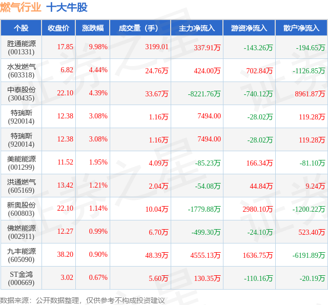 个股表现方面,燃气行业当日领涨股为胜通能源(001331),该股当日报收17.85,上涨9.98%,成交量3199.0,主力资金净流入337.91万元。水发燃气(603318)以上涨4.44%紧随其后,该股当日成交量24.76万,主力资金净流入424.0万元。除此之外,中泰股份(300435)、特瑞斯(920014)、特瑞斯(920014)均进入当日牛股之列。具体个股列表见下表: