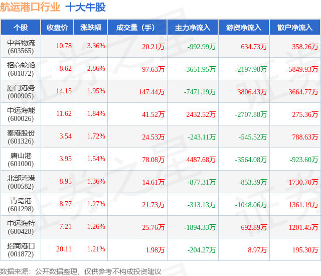 个股表现方面,航运港口行业当日领涨股为中谷物流(603565),该股当日报收10.78,上涨3.36%,成交量20.21万,主力资金净流出992.99万元。招商轮船(601872)以上涨2.86%紧随其后,该股当日成交量97.63万,主力资金净流出3651.95万元。除此之外,厦门港务(000905)、中远海能(600026)、秦港股份(601326)均进入当日牛股之列。具体个股列表见下表: