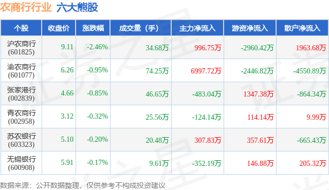 个股表现方面,农商行行业当日领跌股为沪农商行(601825),该股当日报收9.11,下跌2.46%,成交量34.68万,主力资金净流入996.75万元。渝农商行(601077)以下跌0.95%紧随其后,该股当日成交量74.25万,主力资金净流入6997.72万元。除此之外,张家港行(002839)、青农商行(002958)、苏农银行(603323)均进入当日熊股之列。具体个股列表见下表: