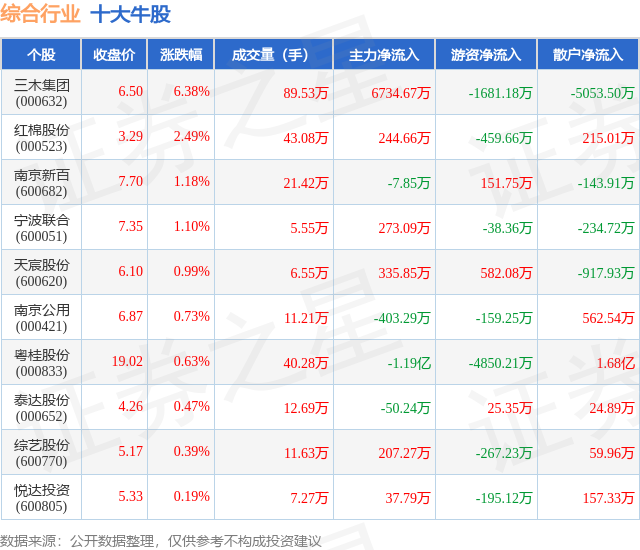 个股表现方面,综合行业当日领涨股为三木集团(000632),该股当日报收6.5,上涨6.38%,成交量89.53万,主力资金净流入6734.67万元。红棉股份(000523)以上涨2.49%紧随其后,该股当日成交量43.08万,主力资金净流入244.66万元。除此之外,南京新百(600682)、宁波联合(600051)、天宸股份(600620)均进入当日牛股之列。具体个股列表见下表: