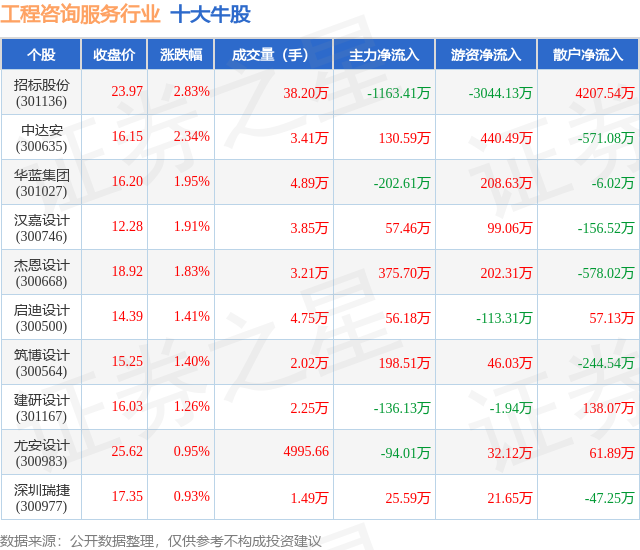 个股表现方面,工程咨询服务行业当日领涨股为招标股份(301136),该股当日报收23.97,上涨2.83%,成交量38.2万,主力资金净流出1163.41万元。中达安(300635)以上涨2.34%紧随其后,该股当日成交量3.41万,主力资金净流入130.59万元。除此之外,华蓝集团(301027)、汉嘉设计(300746)、杰恩设计(300668)均进入当日牛股之列。具体个股列表见下表: