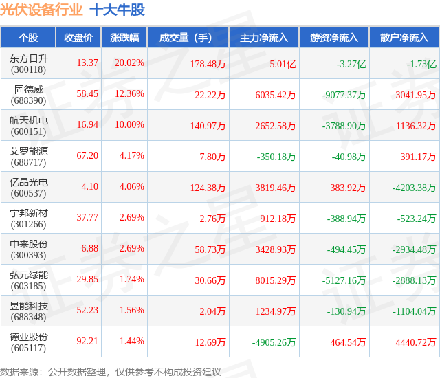 个股表现方面,光伏设备行业当日领涨股为东方日升(300118),该股当日报收13.37,上涨20.02%,成交量178.48万,主力资金净流入5.01亿元。固德威(688390)以上涨12.36%紧随其后,该股当日成交量22.22万,主力资金净流入6035.42万元。除此之外,航天机电(600151)、艾罗能源(688717)、亿晶光电(600537)均进入当日牛股之列。具体个股列表见下表: