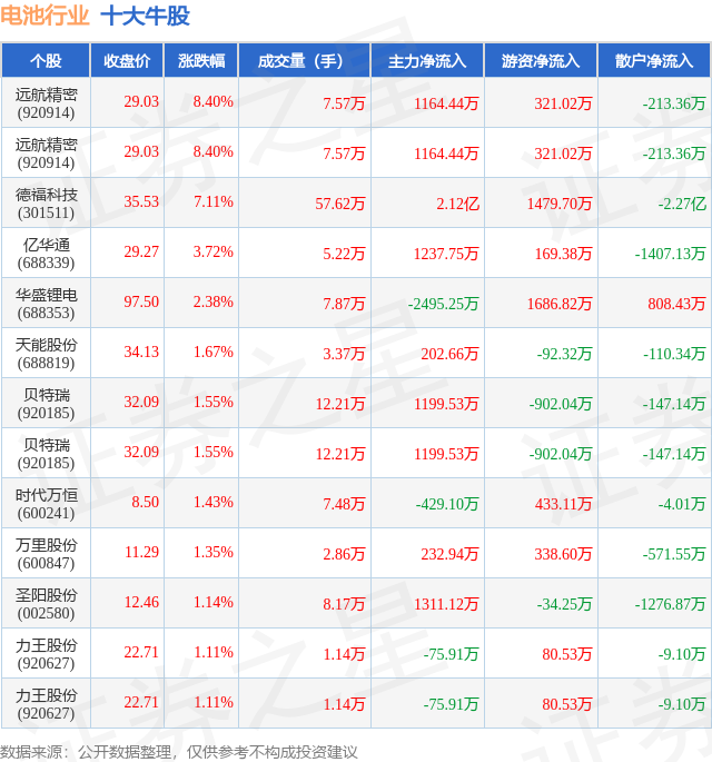 个股表现方面,电池行业当日领涨股为远航精密(920914),该股当日报收29.03,上涨8.4%,成交量7.57万,主力资金净流入1164.44万元。远航精密(920914)以上涨8.4%紧随其后,该股当日成交量7.57万,主力资金净流入1164.44万元。除此之外,德福科技(301511)、亿华通(688339)、华盛锂电(688353)均进入当日牛股之列。具体个股列表见下表: