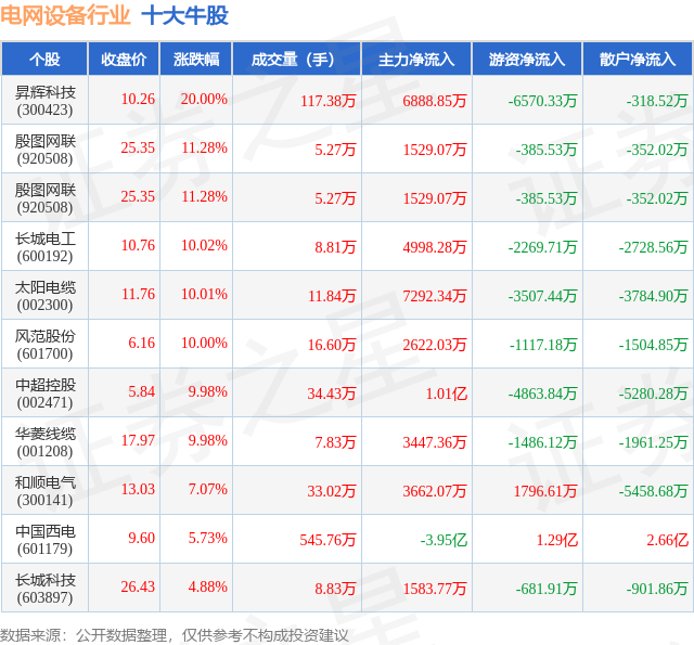 个股表现方面,电网设备行业当日领涨股为昇辉科技(300423),该股当日报收10.26,上涨20.0%,成交量117.38万,主力资金净流入6888.85万元。殷图网联(920508)以上涨11.28%紧随其后,该股当日成交量5.27万,主力资金净流入1529.07万元。除此之外,殷图网联(920508)、长城电工(600192)、太阳电缆(002300)均进入当日牛股之列。具体个股列表见下表: