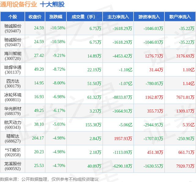 个股表现方面,通用设备行业当日领跌股为驰诚股份(920407),该股当日报收24.59,下跌10.58%,成交量6.75万,主力资金净流出1618.29万元。驰诚股份(920407)以下跌10.58%紧随其后,该股当日成交量6.75万,主力资金净流出1618.29万元。除此之外,海川智能(300720)、哈焊华通(301137)、四方达(300179)均进入当日熊股之列。具体个股列表见下表: