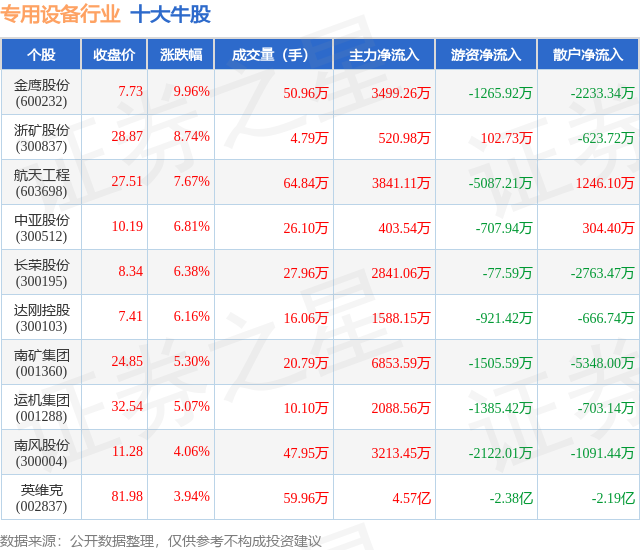 个股表现方面,专用设备行业当日领涨股为金鹰股份(600232),该股当日报收7.73,上涨9.96%,成交量50.96万,主力资金净流入3499.26万元。浙矿股份(300837)以上涨8.74%紧随其后,该股当日成交量4.79万,主力资金净流入520.98万元。除此之外,航天工程(603698)、中亚股份(300512)、长荣股份(300195)均进入当日牛股之列。具体个股列表见下表: