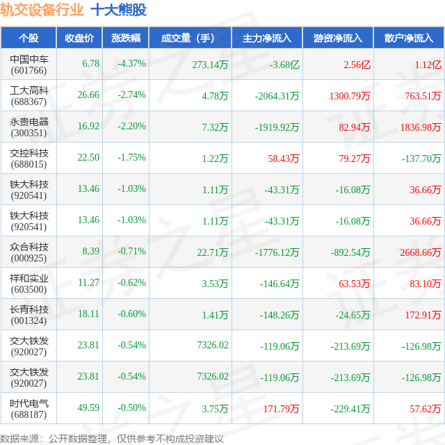 个股表现方面,轨交设备行业当日领跌股为中国中车(601766),该股当日报收6.78,下跌4.37%,成交量273.14万,主力资金净流出3.68亿元。工大高科(688367)以下跌2.74%紧随其后,该股当日成交量4.78万,主力资金净流出2064.31万元。除此之外,永贵电器(300351)、交控科技(688015)、铁大科技(920541)均进入当日熊股之列。具体个股列表见下表: