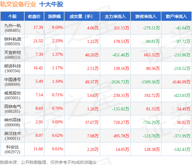 个股表现方面,轨交设备行业当日领涨股为九州一轨(688485),该股当日报收17.39,上涨8.69%,成交量4.0万,主力资金净流入321.15万元。铁科轨道(688569)以上涨2.33%紧随其后,该股当日成交量1.22万,主力资金净流入178.53万元。除此之外,天宜新材(688033)、朗进科技(300594)、中国通号(688009)均进入当日牛股之列。具体个股列表见下表: