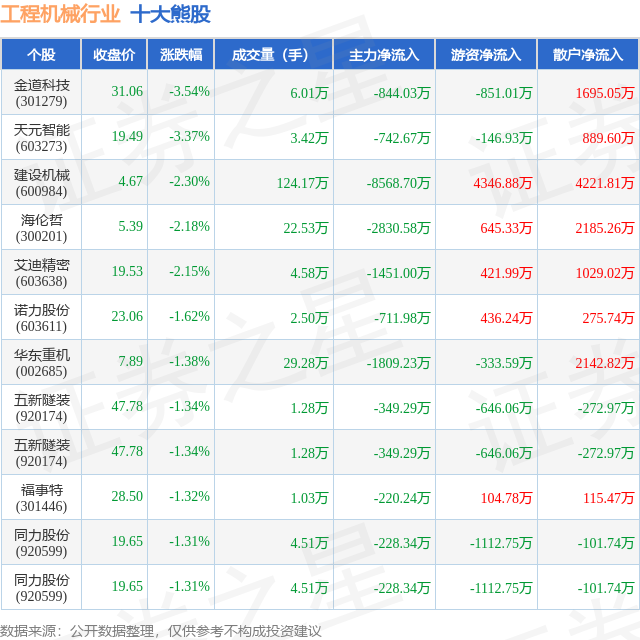 个股表现方面,工程机械行业当日领跌股为金道科技(301279),该股当日报收31.06,下跌3.54%,成交量6.01万,主力资金净流出844.03万元。天元智能(603273)以下跌3.37%紧随其后,该股当日成交量3.42万,主力资金净流出742.67万元。除此之外,建设机械(600984)、海伦哲(300201)、艾迪精密(603638)均进入当日熊股之列。具体个股列表见下表: