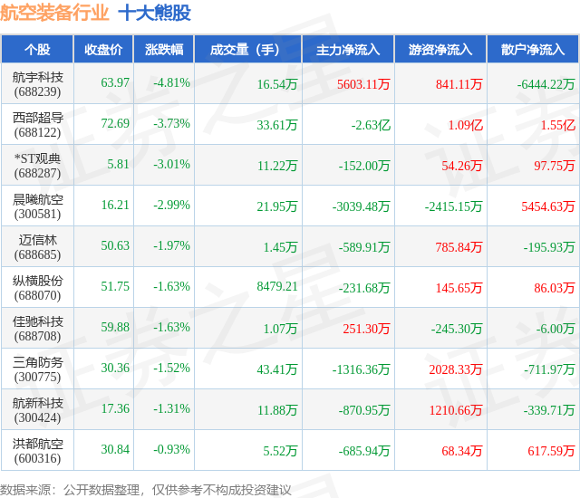 个股表现方面,航空装备行业当日领跌股为航宇科技(688239),该股当日报收63.97,下跌4.81%,成交量16.54万,主力资金净流入5603.11万元。西部超导(688122)以下跌3.73%紧随其后,该股当日成交量33.61万,主力资金净流出2.63亿元。除此之外,*ST观典(688287)、晨曦航空(300581)、迈信林(688685)均进入当日熊股之列。具体个股列表见下表: