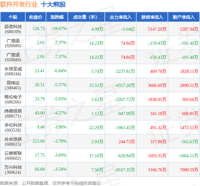 个股表现方面,软件开发行业当日领跌股为品茗科技(688109),该股当日报收126.75,下跌18.67%,成交量4.99万,主力资金净流出1.04亿元。广道退(920680)以下跌7.37%紧随其后,该股当日成交量14.23万,主力资金净流入74.84万元。除此之外,广道退(920680)、永信至诚(688244)、高伟达(300465)均进入当日熊股之列。具体个股列表见下表: